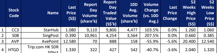 $StarHub(CC3.SI)$ $SingPost(S08.SI)$ $AvePoint(AVP.SI)$ $Trip.com HK SDR 50to1(HTGD.SI)$