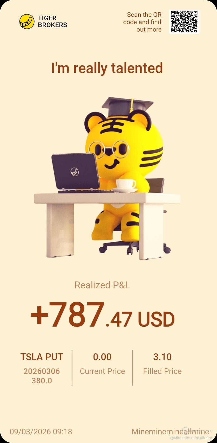 $TSLA 20260306 380.0 PUT$ trading with care and when opportunity arises, size it. This is overnight profit on Wed when I notice a sudden drop in share price. Was confident of 390 support, sell put at 380. Instead of closing the option. I rolled to higher strike price of 385 to earn another $90 for the week.