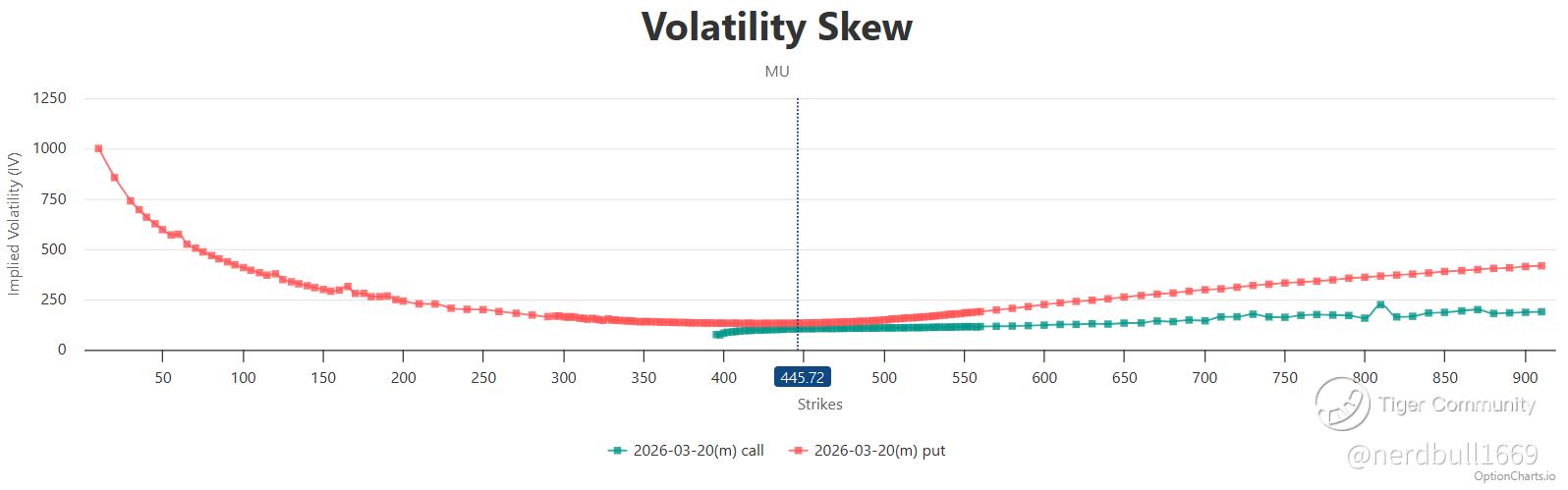 The volatility skew is slightly call-biased, with call IV at 98.9% versus 94.9% for puts. This indicates traders are paying a premium for upside exposure, anticipating a potential "beat and raise" fueled by HBM4 demand. Support is established at $380, with major resistance at $469.