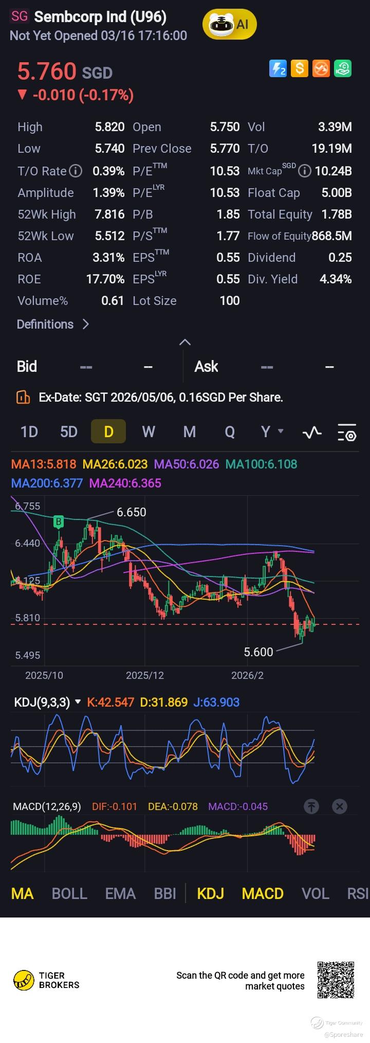Sembcorp Ind - She has bounce-off from 5.67 and closed higher at 5.77, looks like shw may have hit the bottom and rebounded. Yield is about 4.33 percent seem quite decent. XD 6th May 16 cents Final dividend!