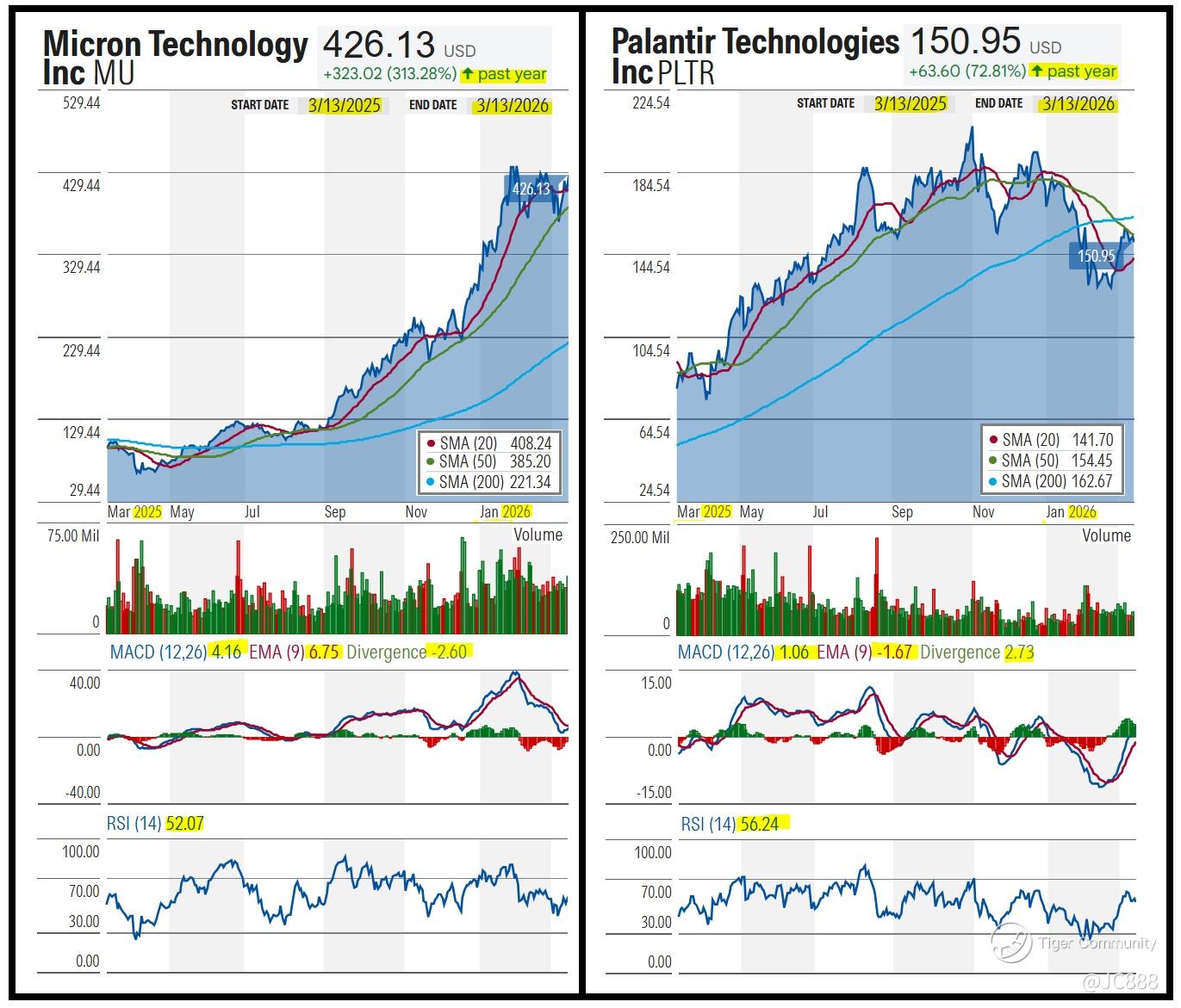 As of 13 Mar 2026 closing, market capitalization for both stocks’ values stand at $479.61 billion (MU) and $360.87 billion (PLTR) , making them 2 of the biggest companies in the world.