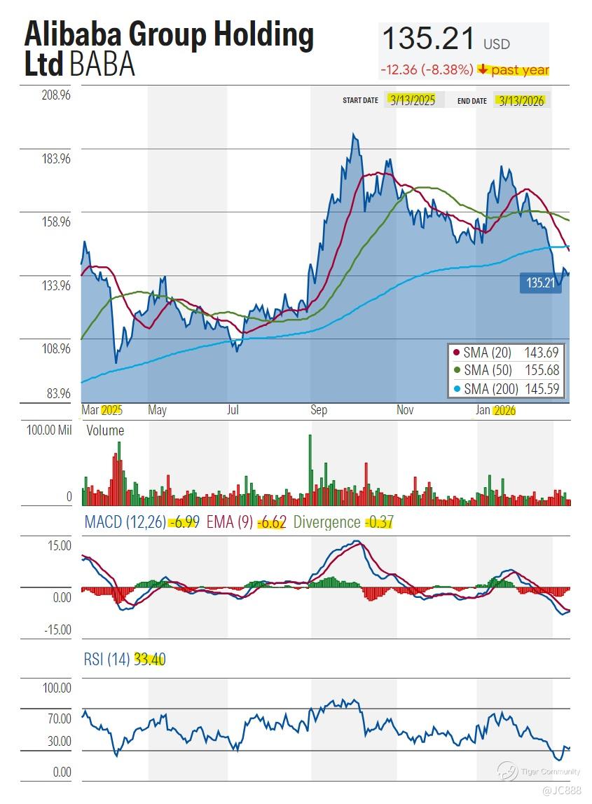 As of Fri, 13 Mar 2026, BABA was marginally higher (+0.75%) rounding off the week at $135.21 /share.