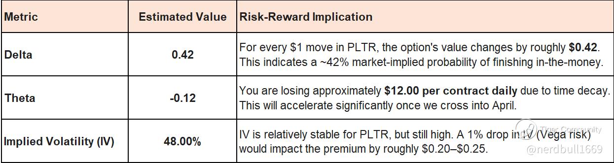 The Reward Side: Since the Delta is 0.42, this position offers significant "gamma" potential. If PLTR rallies toward $165–$170 during the Nvidia GTC window or early April, the Delta will rapidly approach 0.60+, causing the premium to appreciate at an accelerating rate.