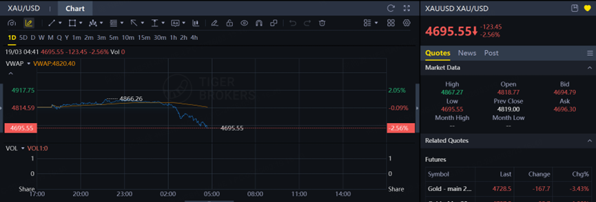 Gold prices saw a sharp decline yesterday, dropping about 3.7%, followed by another 2% decline today. Within just two days, prices broke below the $5,000 and $4,900 levels, falling toward $4,800 and even briefly dipping under $4,700.