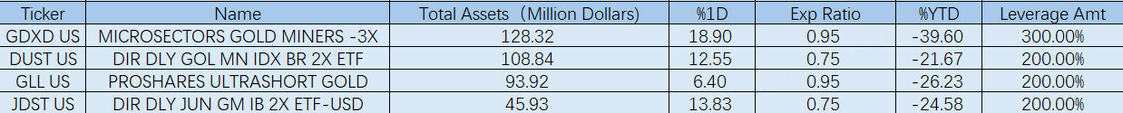 Inverse ETFs moved sharply higher. $Direxion Daily Gold Miners Index Bear 2X Shares(DUST)$ rose 12.55%, $ProShares UltraShort Gold(GLL)$ gained 6.40%, and $Direxion Daily Junior Gold Miners Index Bear 2X Shares(JDST)$ climbed 13.83%, reflecting the amplified performance of inverse products during gold’s decline.