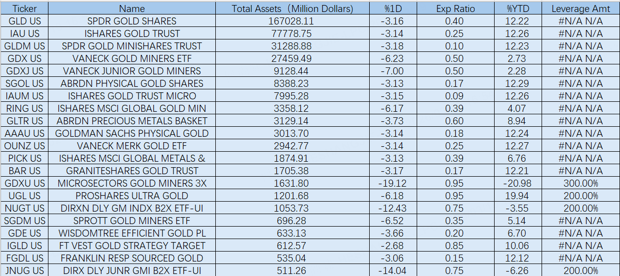 From a one-day performance perspective, gold-related ETFs declined broadly. Physical gold ETFs saw $SPDR Gold ETF(GLD)$ fall 3.16%, $Gold Trust Ishares(IAU)$ drop 3.14%, and $Spdr Gold Minishares Trust(GLDM)$ decline 3.18%. Gold mining ETFs experienced steeper losses, with $VanEck Gold Miners ETF(GDX)$ down 6.23%, $VanEck Junior Gold Miners ETF(GDXJ)$ down 7.00%, and RING falling 6.17%. Leveraged products showed the most volatility, with $MicroSectors Gold Miners 3x Leveraged ETN(GDXU)$ plunging 19.12%, $Direxion Daily Gold Miners Index Bull 2X Shares(NUGT)$ dropping 12.43%, and $Direxion Daily Junior Gold Miners Index Bull 2X Shares(JNUG)$ down 14.04%.
