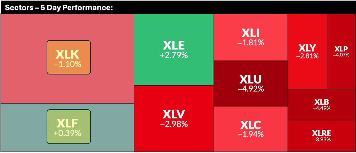 You may recall my special reports on sector rotation (Wednesday is the day for Market Intelligence), where I highlighted that defensives were overbought while growth was oversold. By the time the “Great Rotation” became a popular media topic, the move was already largely complete. Over the last several weeks, Industrials, Staples, Materials, and Healthcare have fallen sharply, with Utilities joining the defensive sell-off this past week. While the week was undoubtedly bearish, Technology and Financials showed relative strength, following only Energy in performance.