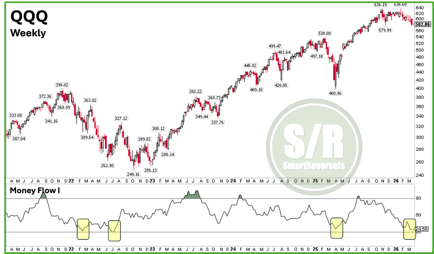 It is worth noting that the $Invesco QQQ(QQQ)$ has reached extreme oversold levels. Based on Money Flow, the index is currently below its 2025 bottom, the 2023 correction, and even the lows of the 2022 bear market. The current reading coincides with the rallies that began in March and June of 2022. While that was a bear market year, we must navigate the immediate price action, and the current scenario suggests a bottom is near.