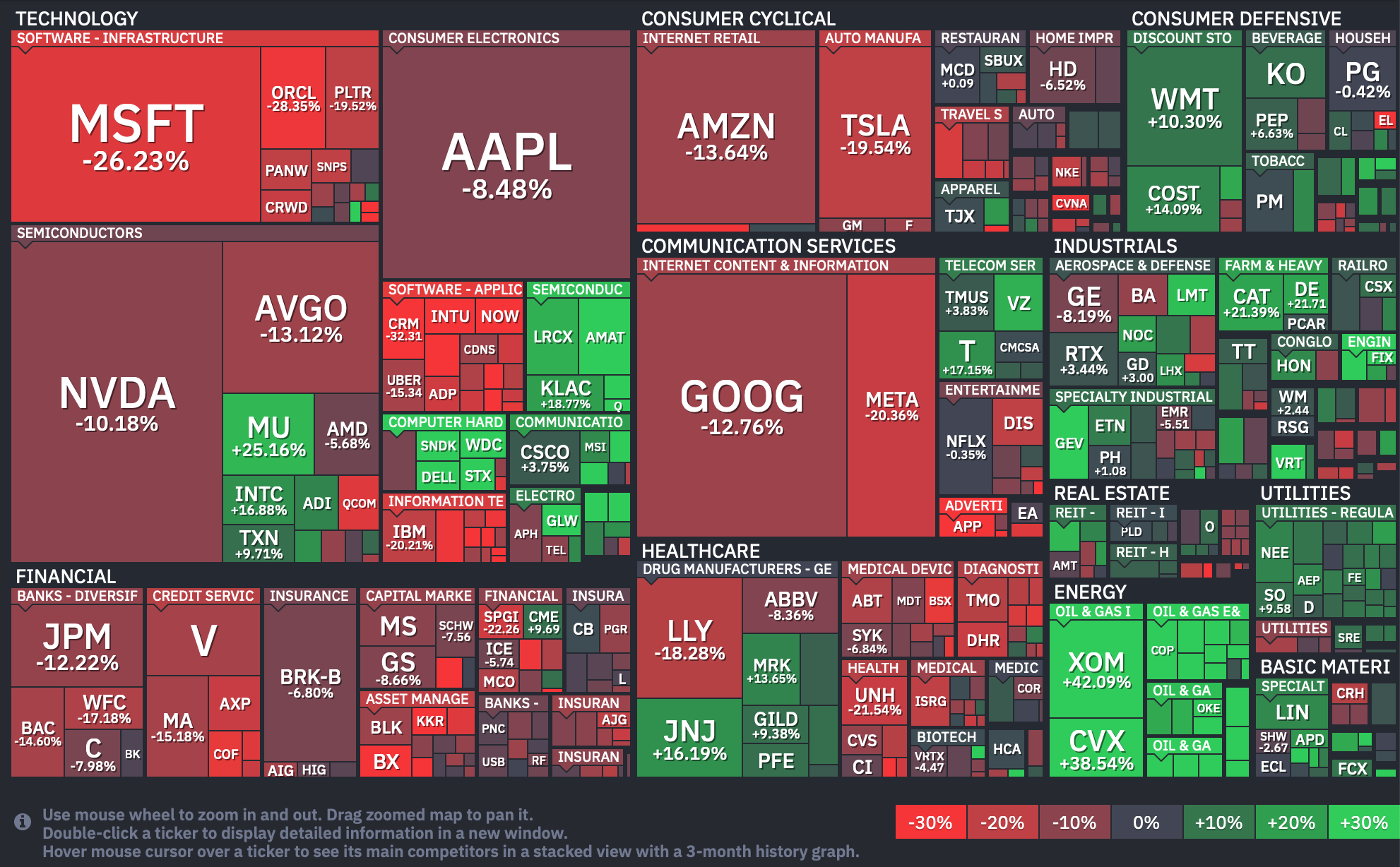 Look at the S&P 500 heat map, and you can see the companies outperforming are primarily in energy, consumer defensive, heavy equipment, and utilities.