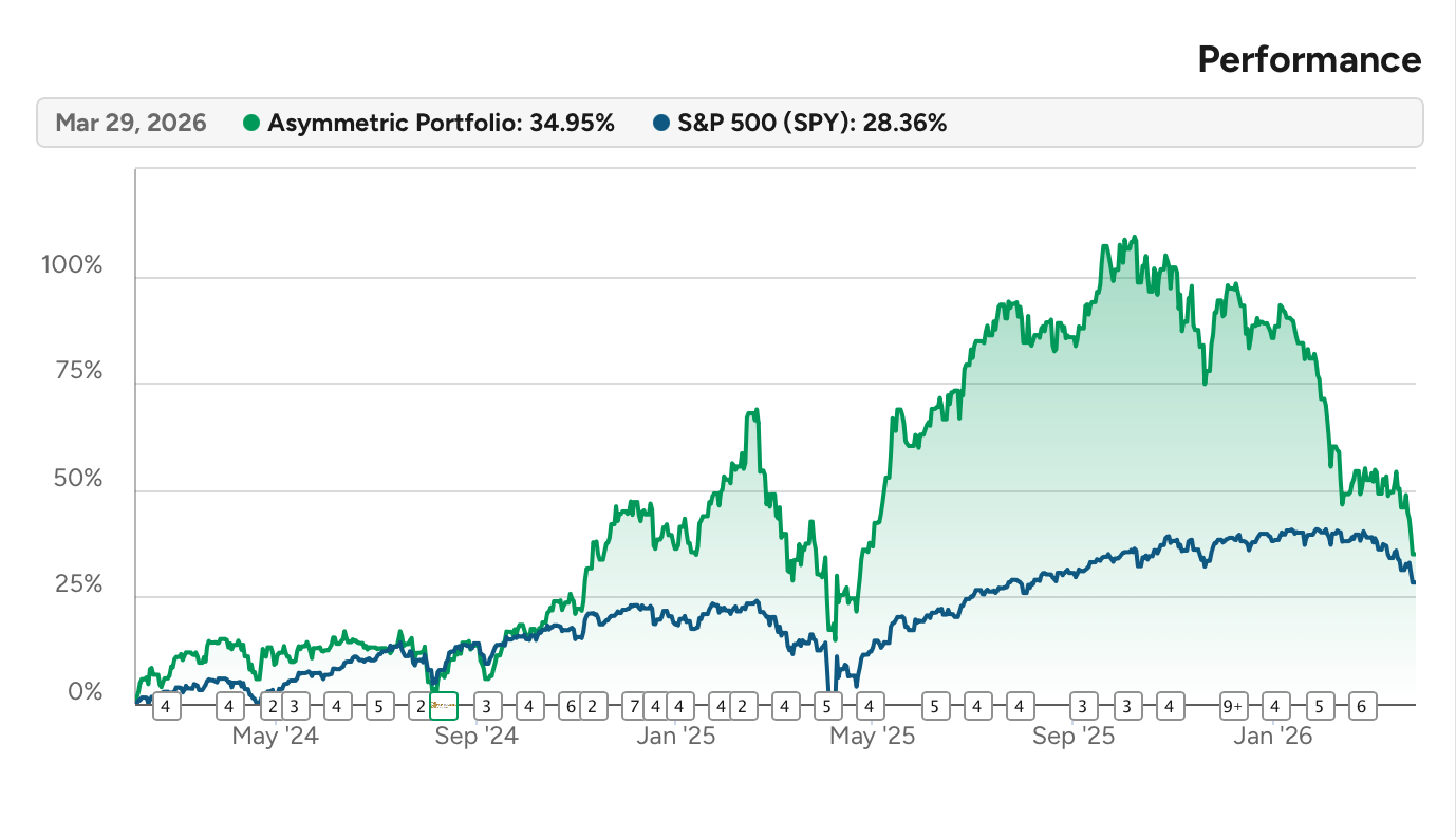 While the market may only be down single digits, the Asymmetric Portfolio is down 27.3% in 2026. Why? Growth, tech, and anything software related is down big in 2026.