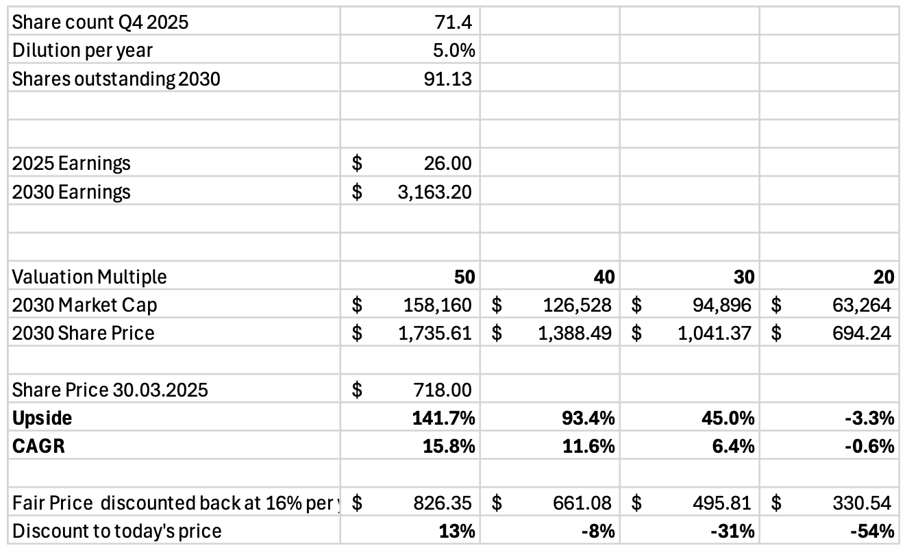 Assuming an exit multiple of 40, we could be looking at a $1,338 stock in 2030, implying an upside of 93%!