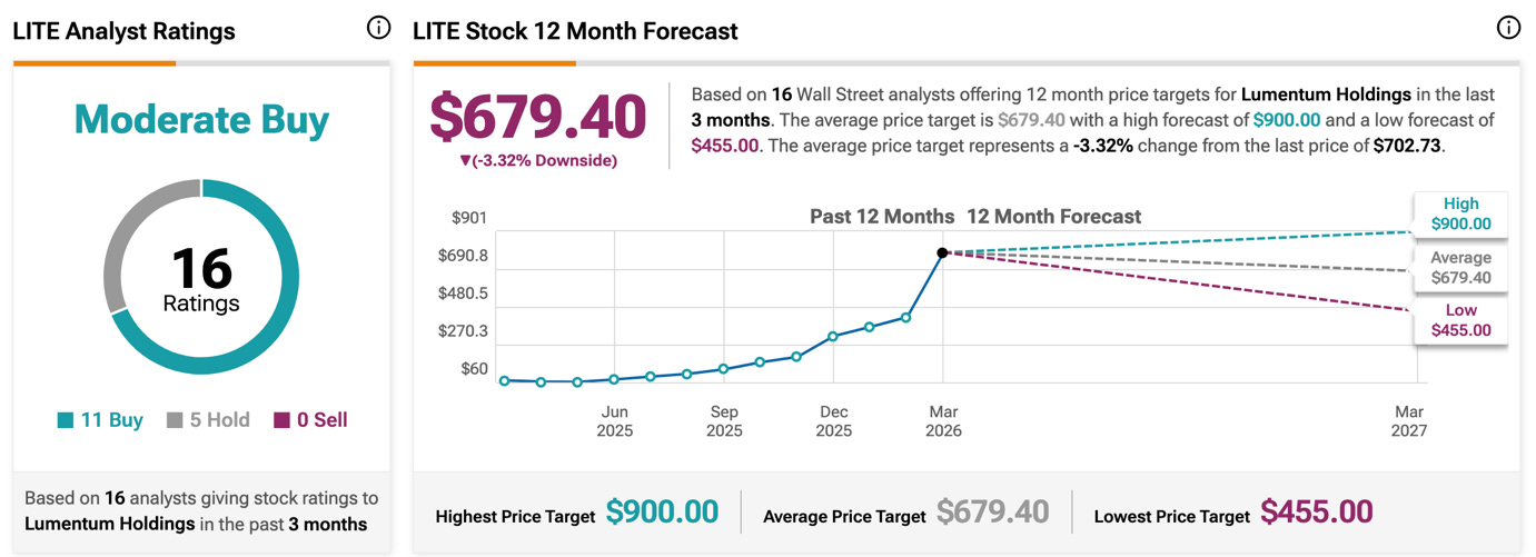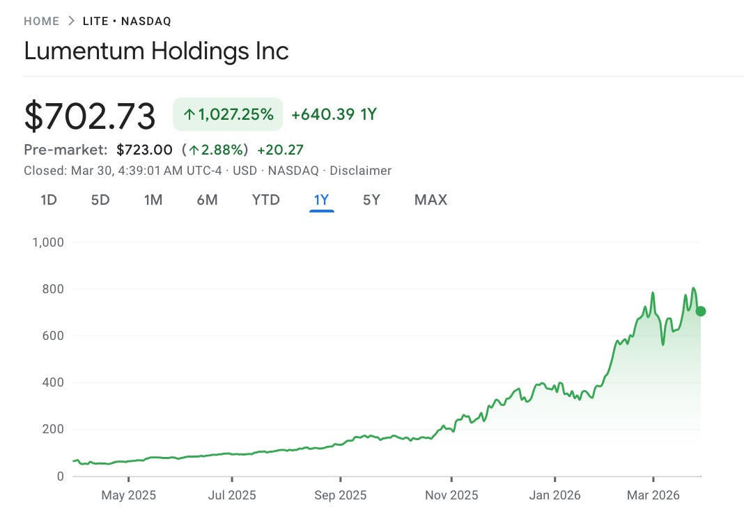 As of March 2026, Lumentum’s stock price was trading around $703 per share. This is a massive increase compared to early 2025, when the stock was trading under $100. Over the past 12 months, the stock has risen by approximately 1,027%, reaching a market cap of $50B.