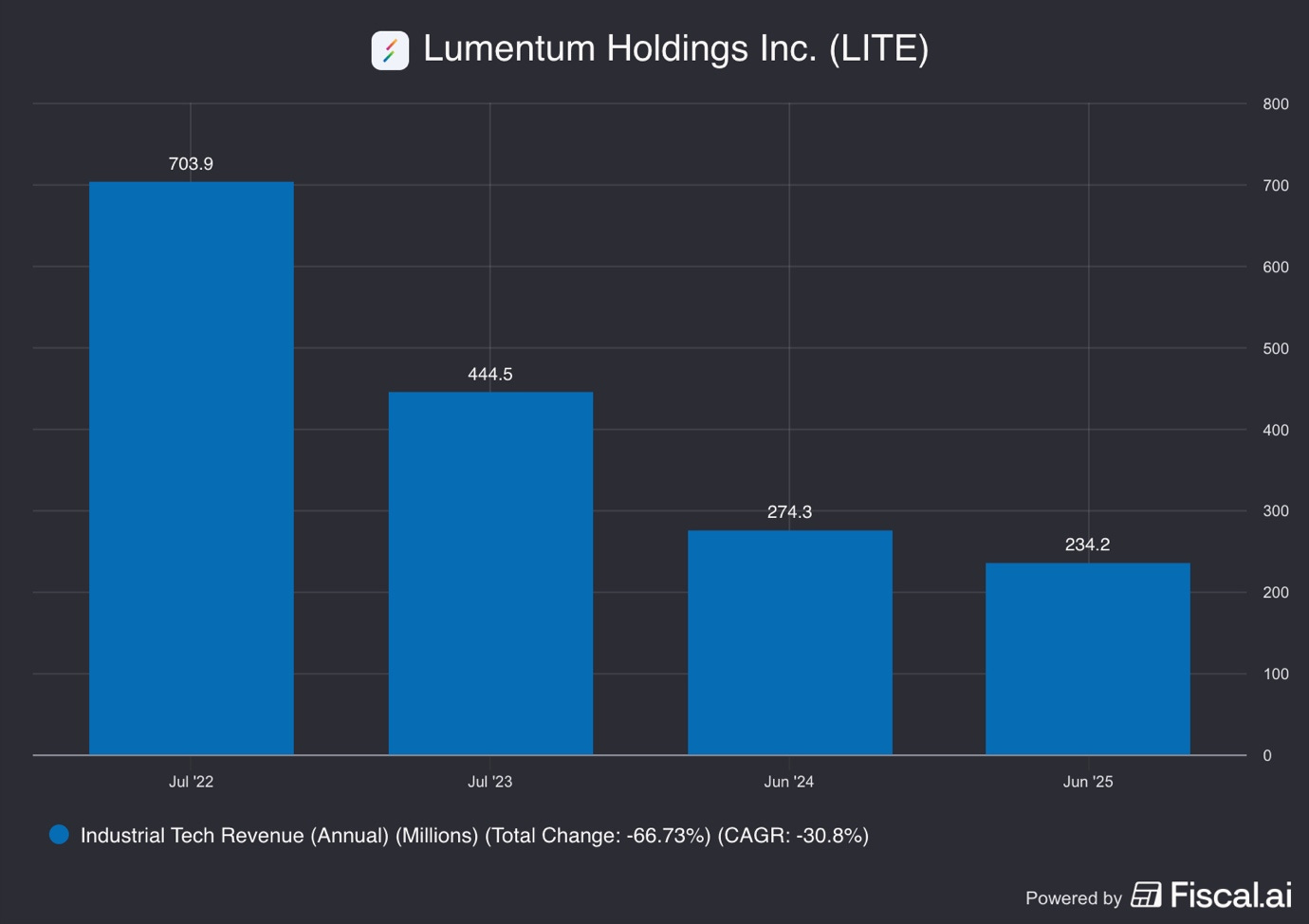 The Cloud & Networking segment is the primary engine of Lumentum’s business, making up about $1.4B or 86% of 2025 revenues.