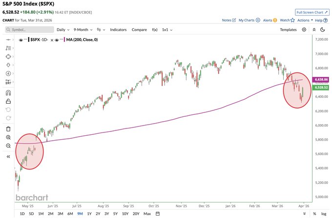 3.S&P 500 $SPX closes under its 200-day moving average for the 9th consecutive day, the longest stretch since April/May 2025 📉📉