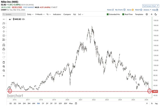 4. Nike $Nike(NKE)$ plunges to its lowest price in more than a decade 📉📉