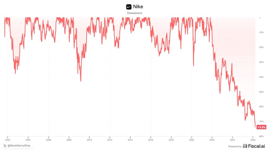 $Nike(NKE)$ going through its largest drawdown in ~30 years.