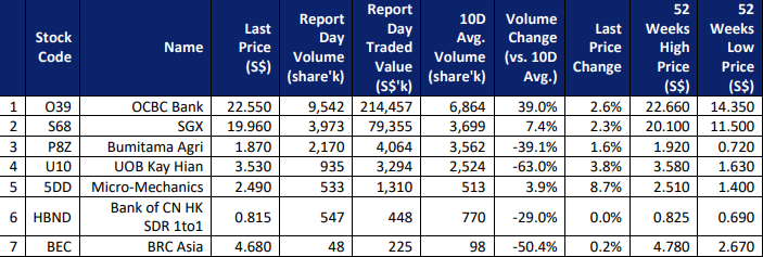 $OCBC Bank(O39.SI)$ $SGX(S68.SI)$ $Bumitama Agri(P8Z.SI)$ $UOB Kay Hian(U10.SI)$ $Micro-Mechanics(5DD.SI)$ $Bank of CN HK SDR 1to1(HBND.SI)$ $BRC Asia(BEC.SI)$