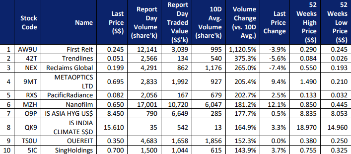 $First Reit(AW9U.SI)$ $Trendlines(42T.SI)$ $Reclaims Global(NEX.SI)$ $METAOPTICS LTD(9MT.SI)$ $PacificRadiance(RXS.SI)$ $Nanofilm(MZH.SI)$ $IS ASIA HYG US$(O9P.SI)$ $IS INDIA CLIMATE S$D(QK9.SI)$ $OUEREIT(TS0U.SI)$ $SING HOLDINGS LIMITED(5IC.SI)$