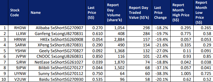 $Alibaba 5xShortSG270907(RHDW.SI)$ $Ganfeng 5xLongUB270831(LLXW.SI)$ $HKEx 5xShortSG260908(HRNW.SI)$ $XPeng 5xShortUB270831(SARW.SI)$ $Geely 5xShortSG270827(YSHW.SI)$ $CNOOC 5xLongUB260831(JVPW.SI)$ $NetEase 5xShortSG261027(SJRW.SI)$ $Bilibili 5xShortSG270127(9JPW.SI)$ $Sunny 5xShortSG270112(UYNW.SI)$ $Baidu 5xShortSG270930(V2UW.SI)$