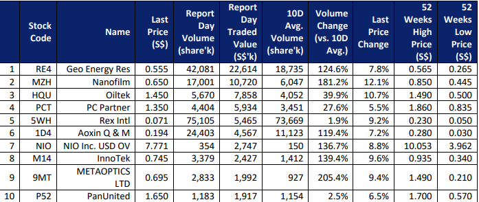 $Geo Energy Res(RE4.SI)$ $Nanofilm(MZH.SI)$ $Oiltek(HQU.SI)$ $PC Partner(PCT.SI)$ $Rex Intl(5WH.SI)$ $Aoxin Q & M(1D4.SI)$ $NIO Inc. USD OV(NIO.SI)$ $InnoTek(M14.SI)$ $METAOPTICS LTD(9MT.SI)$ $PanUnited(P52.SI)$