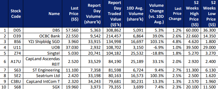 $DBS(D05.SI)$ $OCBC Bank(O39.SI)$ $YZJ Shipbldg SGD(BS6.SI)$ $UOB(U11.SI)$ $Singtel(Z74.SI)$ $CapLand Ascendas REIT(A17U.SI)$ $ST Engineering(S63.SI)$ $Seatrium Ltd(5E2.SI)$ $CapLand IntCom T(C38U.SI)$ $SGX(S68.SI)$