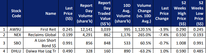 $First Reit(AW9U.SI)$ $NexTier Oilfield Solutions Inc.(NEX)$ $A Lion Short Bond S$(SBO.SI)$ $Daiwa Hse Log Tr(DHLU.SI)$