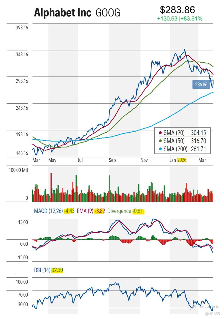 GOOG's closed out Tue, 31 Mar 2026 at $283.86 /share; below 20-day SMA ($304.15) and 50-day SMA ($316.70).