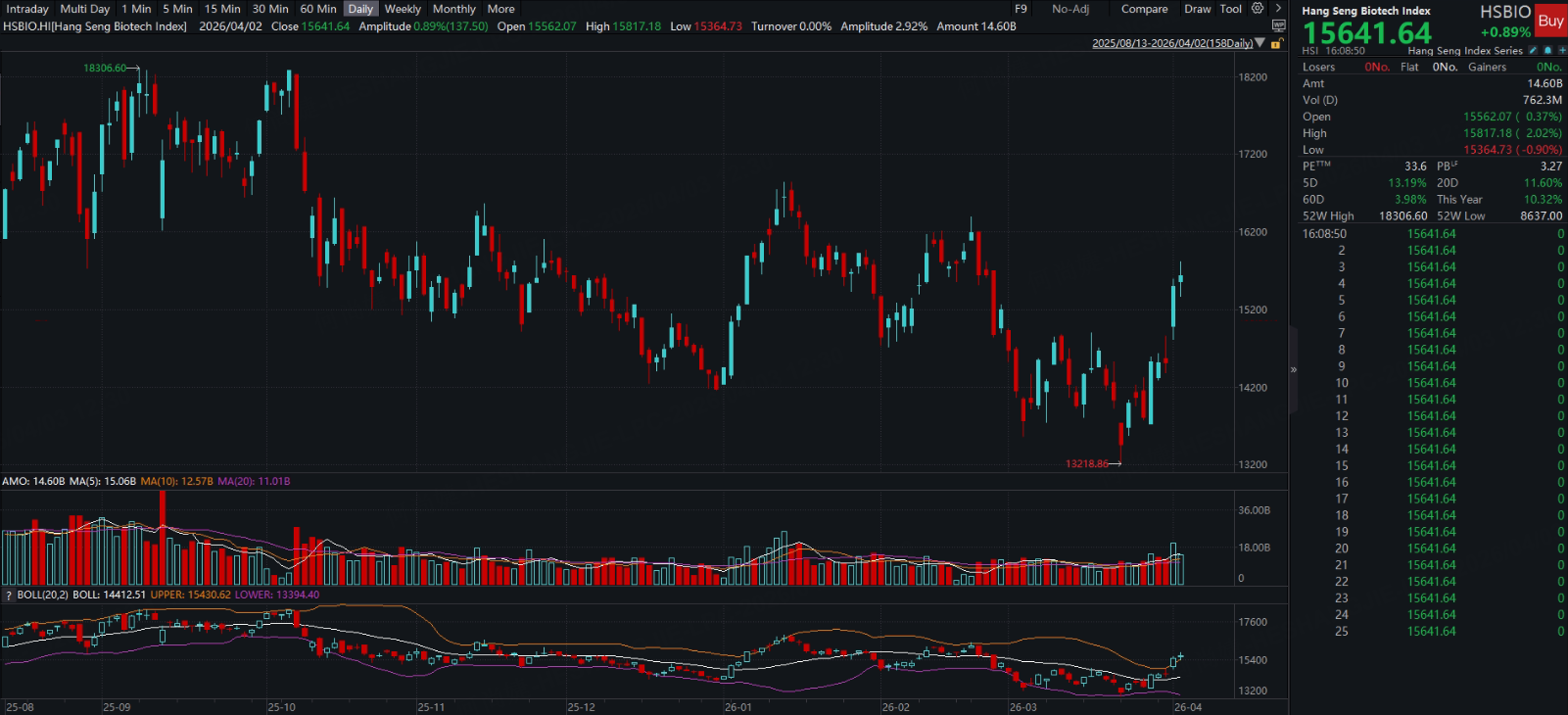 On April 1, the Hang Seng Biotech Index surged 6.78% in a single day, followed by another 0.89% gain on April 2, closing at 15,641.