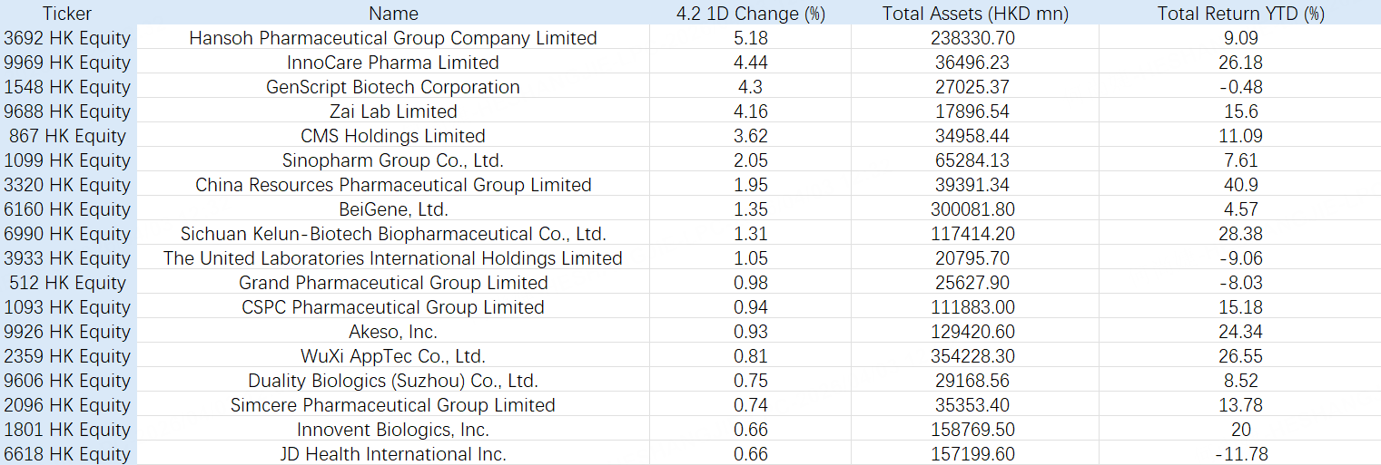 At the stock level, $HANSOH PHARMA(03692)$ rose 5.18%, $INNOCARE(09969)$ gained 4.44%, $GENSCRIPT BIO(01548)$ increased 4.30%, $ZAI LAB(09688)$ advanced 4.16%, and $CMS(00867)$ climbed 3.62%. At the same time, $CHINARES PHARMA(03320)$ , $SINOPHARM(01099)$ , and $BEIGENE(06160)$ also moved higher, indicating that capital is spreading across both innovative drug makers and traditional pharmaceutical companies.