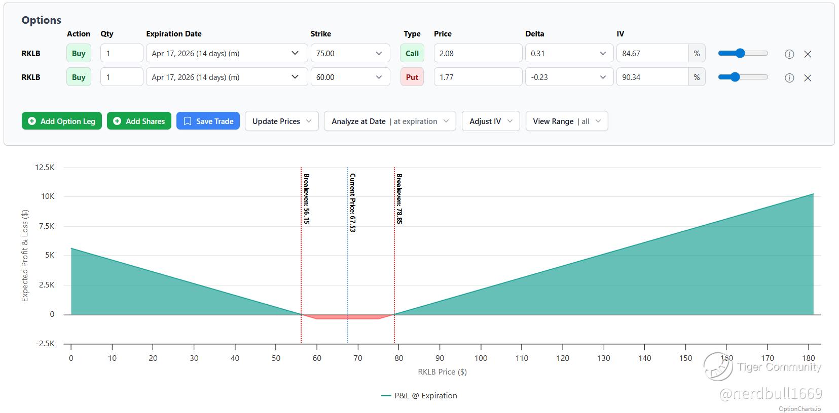 Option Strategy (Long Straddle): Given the high implied volatility (around 95–100%), a straddle (buying both a put and a call) is expensive. Instead, consider a Strangle (e.g., Apr 17 $60 Put / $75 Call) to profit from a massive move in either direction.