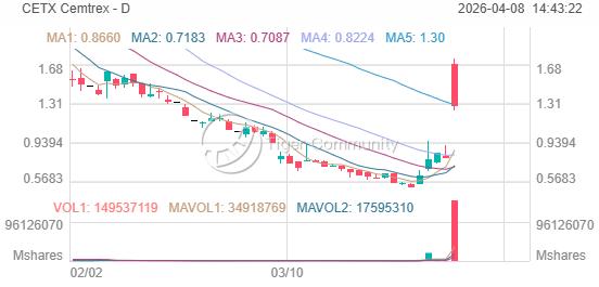 CETX closed at $1.29 on 2026-04-07, surging a massive +62.12%. This puts it 96.9% below its 52-week high of $42.60.