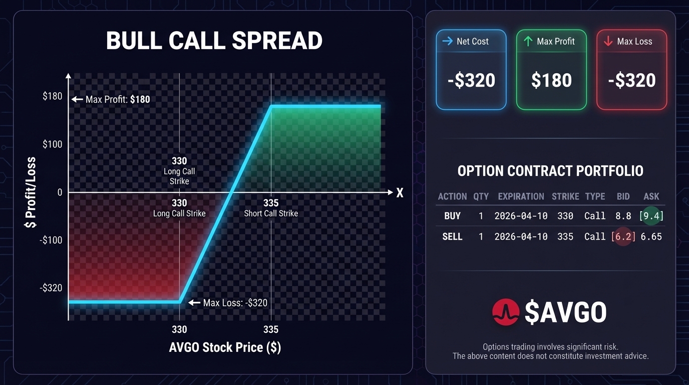 $Broadcom(AVGO)$ Options Bull Call Spread: Cost $320, Max Profit $180 on Apr 8, 2026