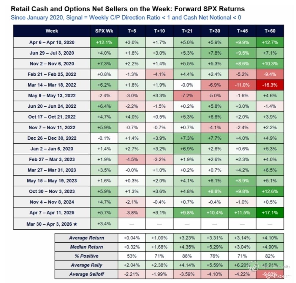 According to Citadel's flow data, this kind of capitulation has only shown up 18 times since 2020. In 82% of those cases, the market was higher 60 days later, with an average return of about +7%. That's not a signal — just context.