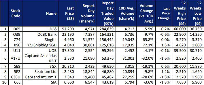 $DBS(D05.SI)$ $OCBC Bank(O39.SI)$ $Singtel(Z74.SI)$ $YZJ Shipbldg SGD(BS6.SI)$ $UOB(U11.SI)$ $CapLand Ascendas REIT(A17U.SI)$ $SGX(S68.SI)$ $Seatrium Ltd(5E2.SI)$ $CapLand IntCom T(C38U.SI)$ $SIA(C6L.SI)$