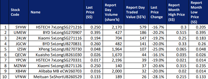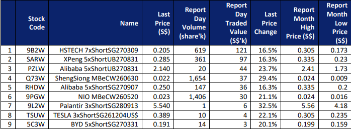 $HSTECH 7xShortSG270309(9B2W.SI)$ $XPeng 5xShortUB270831(SARW.SI)$ $Alibaba 5xShortUB270831(PZLW.SI)$ $ShengSiong MBeCW260630(Q73W.SI)$ $Alibaba 5xShortSG270907(RHDW.SI)$ $NIO MBeCW260520(9PGW.SI)$ $Palantir 3xShortSG280913(9L2W.SI)$ $TESLA 3xShortSG261204US$(TSUW.SI)$ $BYD 5xShortSG270331(5C3W.SI)$