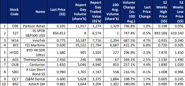 $Parkson Retail(O9E.SI)$ $SS SPDR S&P500 USD(S27.SI)$ $InnoTek(M14.SI)$ $YZJ Maritime(8YZ.SI)$ $BYD HK SDR 10to1(HYDD.SI)$ $TheHourGlass(AGS.SI)$ $Centurion(OU8.SI)$ $A Lion Short Bond S$(SBO.SI)$ $Q&M Dental(QC7.SI)$ $Aztech Gbl(8AZ.SI)$