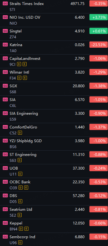SG Morning Call|Singapore Stocks Opened Lower; Nio Up 4%; Katrina Down 23%; SIA, SGX, CapitaLand Investment Down 1%