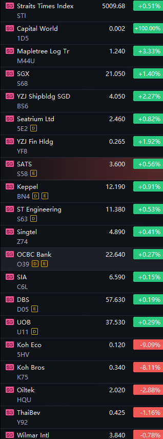 SG Morning Call|STI Opened 0.5% Higher; Capital World Up 100%; Mapletree Log Up 3%; Koh Eco Down 9%; Koh Brothers Down 8%; Oiltek Down 3%