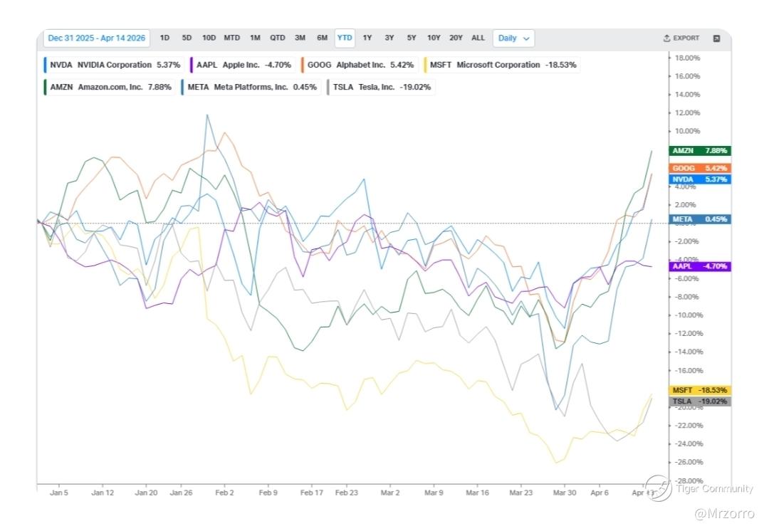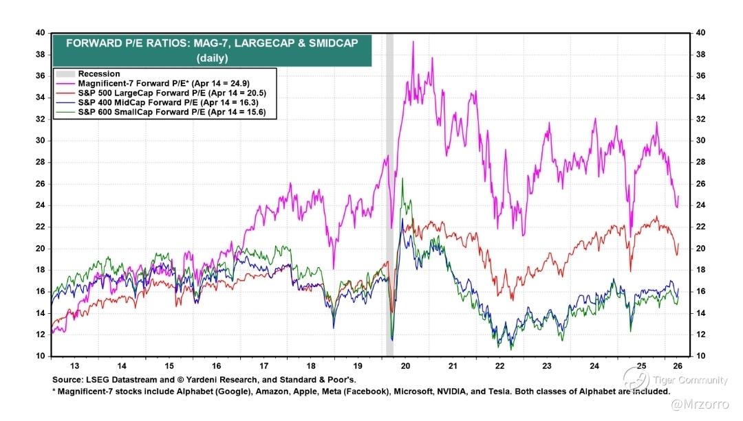 The Mag-7 forward P/E sits at 24.9 times as of April 14, while the S&P 500 large-cap forward P/E is 20.5 times. For a market standing close to new highs, that is not an aggressive multiple. It looks more like a market that has already digested a lot of macro fear, capex skepticism, and rate pressure.