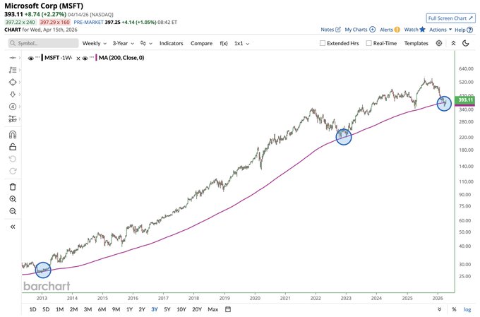 Microsoft $MSFT on track to close above its 200-week moving average for the first time in 4 weeks 📈 Historically, buying at this level has worked out pretty well 🤑