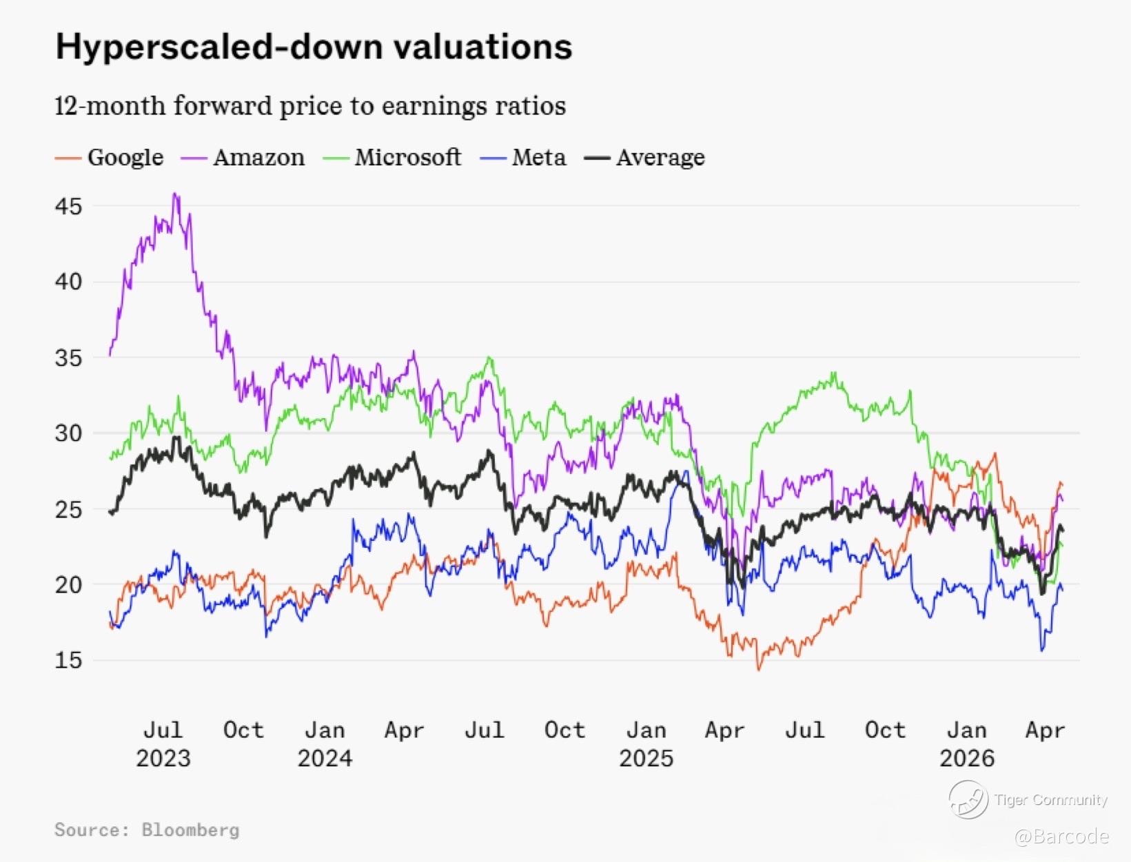 π The Bloomberg chart reinforces what the market is quietly signalling. Forward multiples across Alphabet Inc. ($GOOGL), Amazon ($AMZN), Microsoft ($MSFT) and Meta Platforms ($META) have been structurally compressing since mid-2023 despite one of the strongest earnings upgrade cycles in recent history.