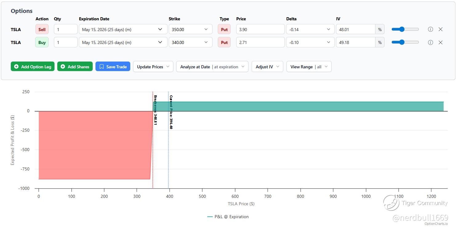 Conservative: Selling the $350 put and buying the $340 put. This aligns with the major support level identified by analysts near the April 9 lows (~$340).