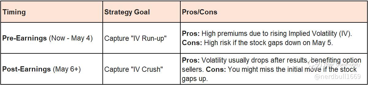 Post-Earnings (The Stability Play): Waiting until May 6 allows you to benefit from "IV Crush"—the rapid drop in option prices once uncertainty is removed. This is safer if the stock finds a new, higher floor after the news.