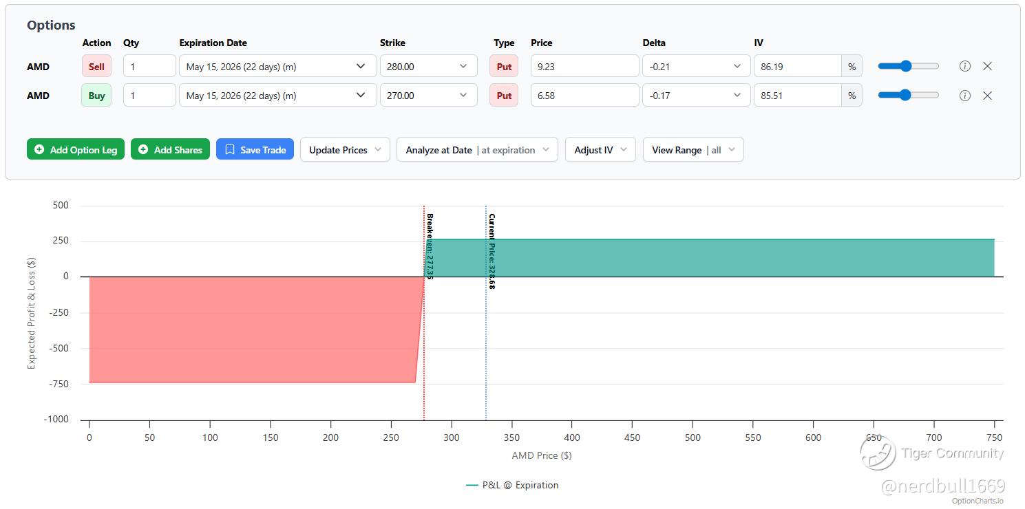 Exit Plan: If AMD breaks $285 before earnings, consider closing the trade to avoid the binary risk of the report. If AMD stays above $300 after earnings, you can likely close the trade for 80-90% of the max profit on May 6 or 7.