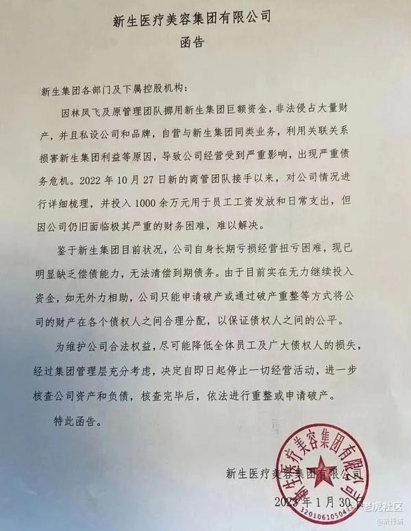 其中,“新生醫療美容集團有限公司函告”圖片內容顯示,因林鳳飛(新生醫療法定代表人)及原管理團隊挪用新生集團鉅額資金,非法侵佔大量財產,並且私設公司和品牌,自營與新生集團同類業務,利用關聯關係損害新生集團利益等原因,導致公司經營受到嚴重影響,出現嚴重債務危機。