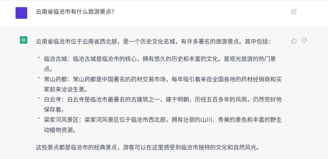 阮一峯老師問它在雲南一個小城有哪些景點,它瞎編了一大堆並不存在的景點: