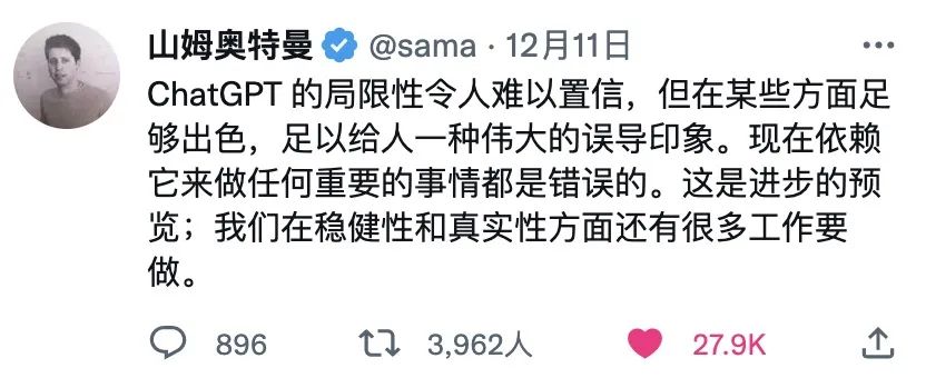 所以,儘管不可否認,現階段ChatGPT的確有諸多侷限性,這個結論不是我說的,是它的創造團隊OpenAI的CEO說的——