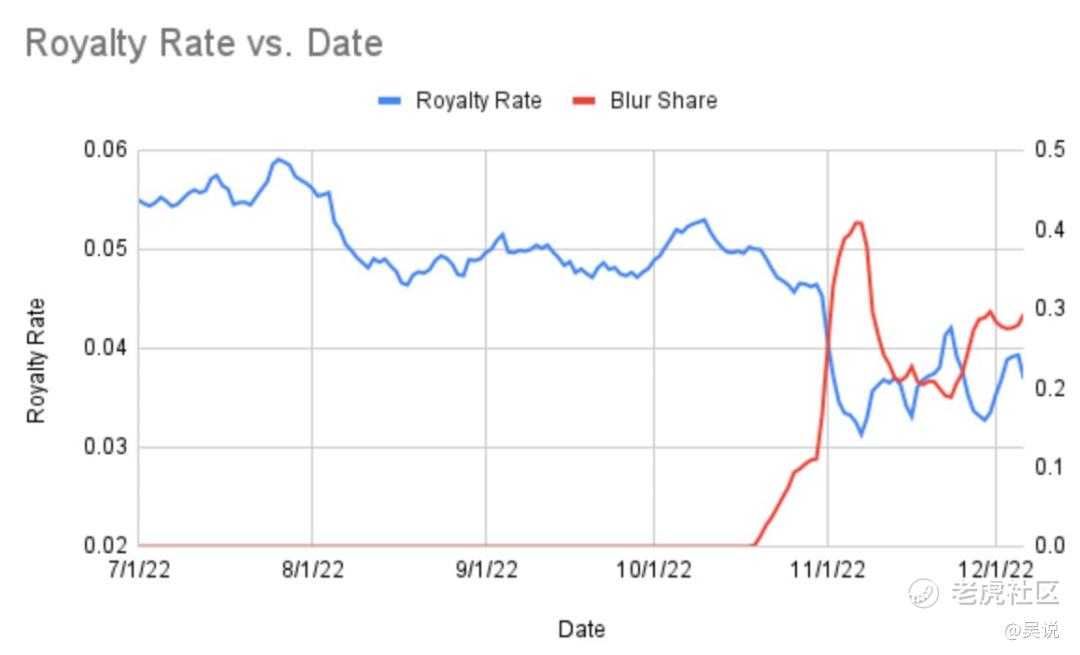一直以來,版稅是 NFT 交易市場的敏感話題,“交易者希望利潤最大化,收藏家希望支持創作者,創作者希望獲得更多的版稅收入”。因爲版稅在無法在多個市場上強制執行的,因而不同平臺版稅設置不一,Blur 默認爲 OpenSea、LooksRare 和 X2Y2 中的最高版稅。當交易者在 Blur 上上架時,他們可以自定義其上架的版稅。但此前 SudoSwap 和 X2Y2 分別的零版稅和自定義版稅就已經引起市場上很大的議論,市場認爲自定義或零版稅使項目方失去部分資金持續發展,因此 Blur 期望通過空投激勵預期鼓勵預期交易者使用版稅。在第二輪空投中,Blur 的使用者版稅設定越高將獲得越高的忠誠度從而獲得更多空投,而針對 Sudoswap 這種零版稅平臺用戶遷移獎勵,支付版稅的交易者改爲在 Blur 上掛單並將版稅設置爲 Sudoswap 的平臺費用 (0.5%),就可以獲得同樣多的利潤並獲得比其他方式更大的空投。不過根據 Proof 研究總監 NFTstatistics.eth 數據,這種預期鼓勵實際並沒有阻止低版稅甚至說零版稅行爲,Blur 整體平均版稅率僅爲 0.65%(如下圖),並帶動了整體 NFT 市場版稅的下降(如下圖)。