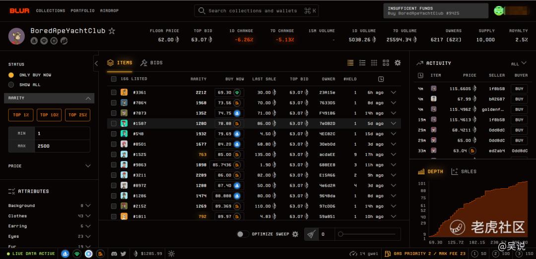 在 UI/UX 上,Blur 也匹配着專業交易員的習慣。以 BAYC 爲例,Blur 主頁除了展示價格、上架時間、上次售價外,也會直接顯示不同 NFT 稀有度,使用者可以直接選擇 NFT 的稀有程度(1%,10%,25%)或價格區間進行瀏覽,畫面右側顯示實時的 NFT 的銷售購買及上架時間信息,右下方則會展示該項目 NFT 的價格深度區間。點進具體的 NFT 時,Blur 會展示該 NFT 的具體特徵,並在一旁展示給出相關特徵的上次銷售時間、地板價和各特徵的交易量佔比,讓交易者自行判斷該 NFT 的稀有程度。