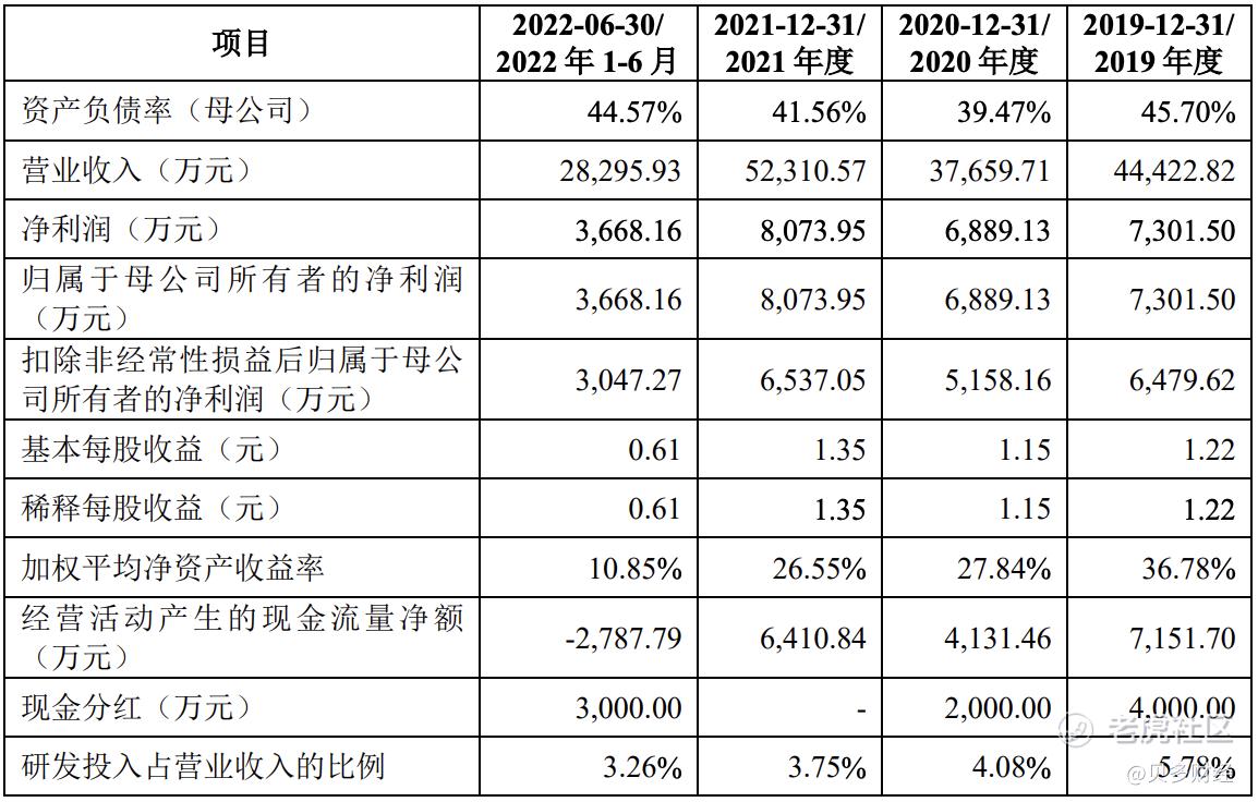 2019年、2020年、2021年和2022年上半年,金標股份的營收分別爲4.44億元、3.77億元、5.23億元2.83億元;淨利潤分別爲7301.50萬元、6889.13萬元、8073.95萬元和3668.16萬元,扣非後淨利潤分別爲6479.62萬元、5158.16萬元、65377.05萬元和3047.27萬元。